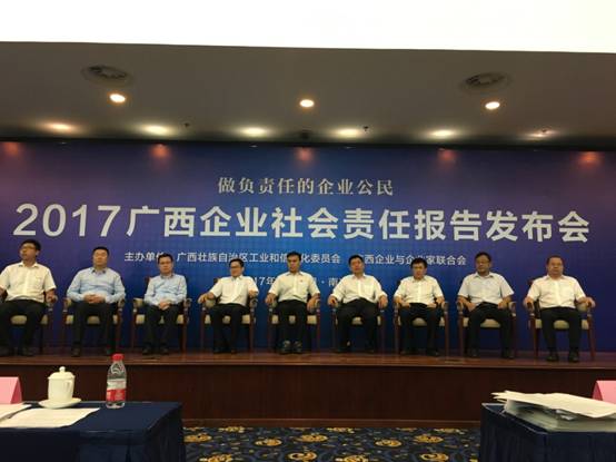 2017年6月15日,來自廣西各地的代表企業(yè)、社會(huì)責(zé)任工作專家、新聞媒體記者以及相關(guān)部委與行業(yè)協(xié)會(huì)領(lǐng)導(dǎo)共聚國(guó)際會(huì)議中心新聞發(fā)布廳,隆重召開“主題為踐行‘創(chuàng)新、協(xié)調(diào)、綠色、開放、共享’發(fā)展理念——2017廣西企業(yè)社會(huì)責(zé)任報(bào)告發(fā)布會(huì)”。本次會(huì)議由廣西企業(yè)家聯(lián)合會(huì)主辦,自治區(qū)副主席陳剛、自治區(qū)工信委副主任陳清出席會(huì)議并致辭。