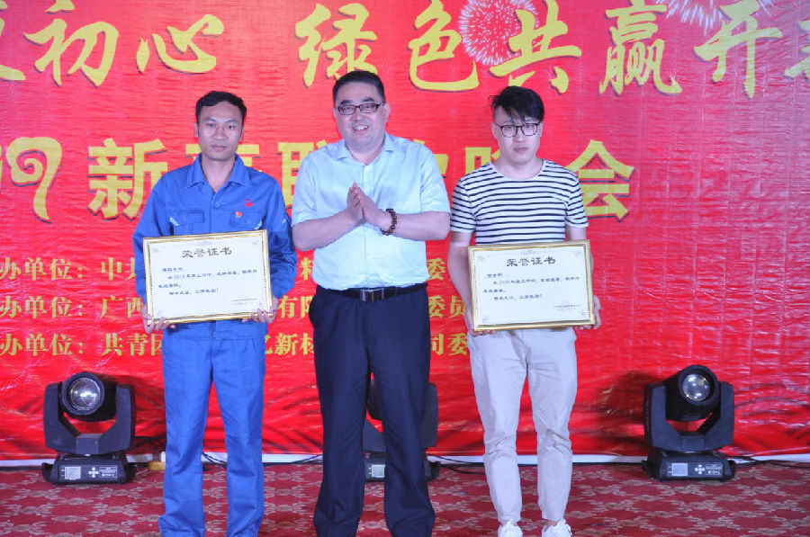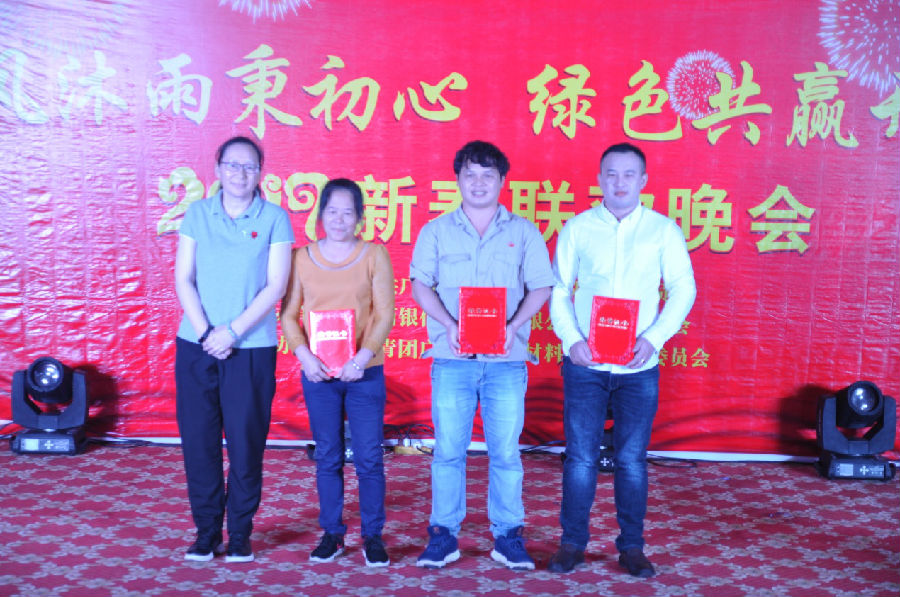 王小豐董事長(zhǎng)(中)頒發(fā)廣西銀億獲集團(tuán)先進(jìn)基層工會(huì)組織及工會(huì)積極分子(劉美強(qiáng)左)