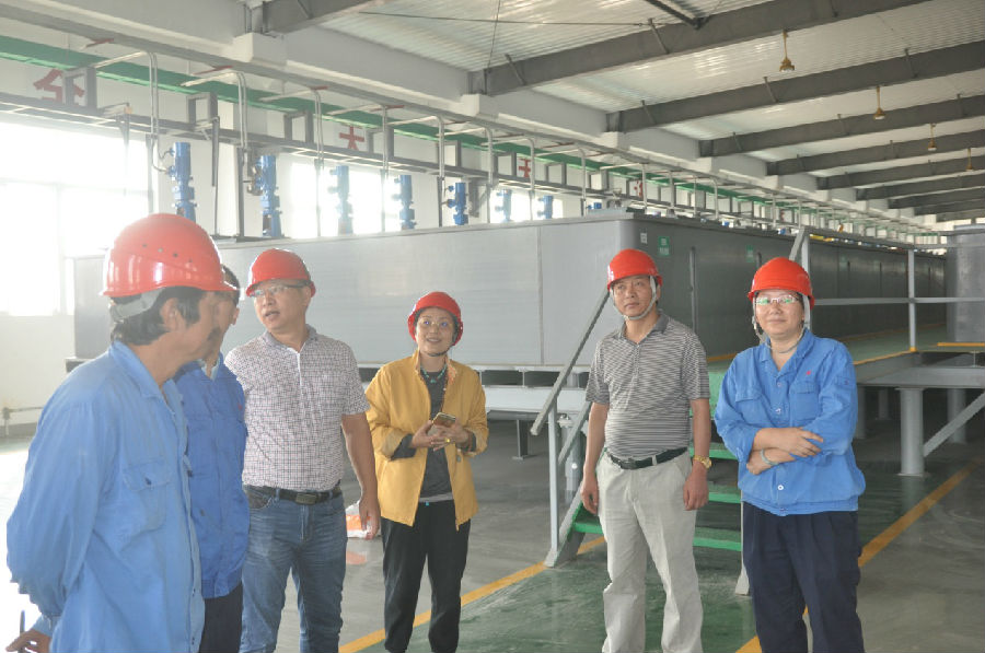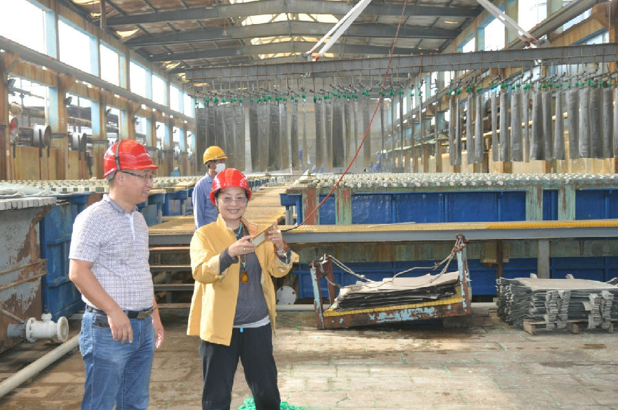在精煉三車間,趙總從一樓走到二樓,邊走邊看,任總詳細向趙總匯報了精煉三車間的生產(chǎn)情況,生產(chǎn)工藝。精煉三車間是2014年新建的車間,2015年11月投產(chǎn),主要生產(chǎn)電積銅。趙總聽了任總的介紹,不停地點頭稱贊。在二樓,趙總停下來,認真觀看工人對產(chǎn)出的銅板進行外觀校正,看到光亮如鏡,四周整齊的銅板,連聲稱贊廣西銀億的制銅工藝確實先進,非常高興,不由自主的拿出智能手機,拍下了車間工人勞動的情景。