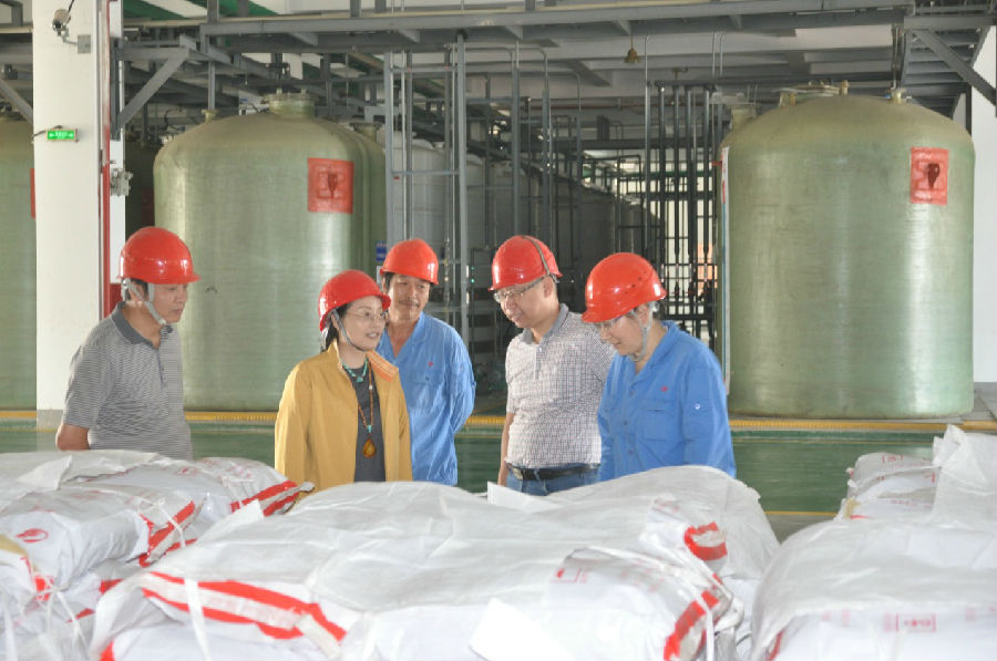不一會,車到了鎳鹽車間。走進高大寬敞整潔的鎳鹽車間,一進門,趙總就看到了堆放整齊的氯化鈷產(chǎn)品,走到產(chǎn)品邊,興奮地用手摸著氯化鈷產(chǎn)品,連聲稱贊:“產(chǎn)品好!包裝也好!”巡視車間設備運行情況,趙總感到十分驚奇,諾大的車間,生產(chǎn)線設備運行平穩(wěn),噪音小,無灰塵,管控人員少,監(jiān)控室多個屏幕,準確的反映了設備運行情況。車間主任張磊認真的向趙總匯報了鎳鹽車間生產(chǎn)情況,并說鎳鹽車間目前還沒有完全投產(chǎn),部分生產(chǎn)設備正在安裝中,如果全部投產(chǎn),產(chǎn)量將翻一番。趙總聽了非常滿意,在車間與公司任總、吳總助、章主任、車間張主任合影。