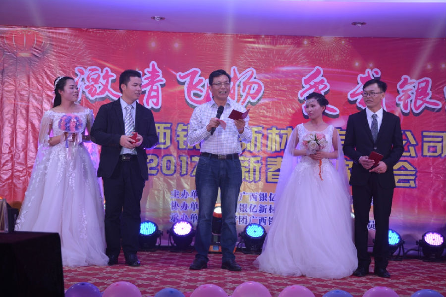 晚會中段安排了集體婚禮,給2對新人舉辦婚禮,將晚會歡樂的氣氛推向了高潮。新郎楊家樹和新娘吳秋麗;新郎藍偉東和新娘潘桂嬌,都是大學(xué)本科畢業(yè),學(xué)的是化學(xué)專業(yè),入職公司,工作勤勉,奮發(fā)向上,他們把心放在了工作上,把家安在了公司,把夢想放在了銀億事業(yè)上,產(chǎn)生了神奇的“化學(xué)反應(yīng)”,他們比翼齊飛,喜結(jié)連理,是眾望所歸,佳偶天成。廣西銀億公司工會主席章群宏作為證婚人,發(fā)表了熱情洋溢的證婚詞:“在今天大喜的日子里,我謹(jǐn)代表公司工會,向兩對新人表示熱烈地祝賀和美好地祝愿。衷心祝愿他們相濡以沫,白頭偕老,甜甜蜜蜜,幸福永遠,早生貴子!”章主席查看了兩對新人的《結(jié)婚證》,幽默地大聲說:“我宣布:新郎楊家樹和新娘吳秋麗;新郎藍偉東和新娘潘桂嬌,婚姻合法有效,即日起,持證上崗,掛牌營業(yè)!”全聲歡聲雷動,掌聲四起,經(jīng)久不息。這場集體婚禮,表達了員工“愛我銀億”的心聲――銀億凝聚人心,事業(yè)興旺發(fā)達!